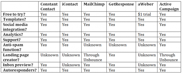 To get things started, below is a comparison chart for the features of the six of the most popular email marketing platforms: